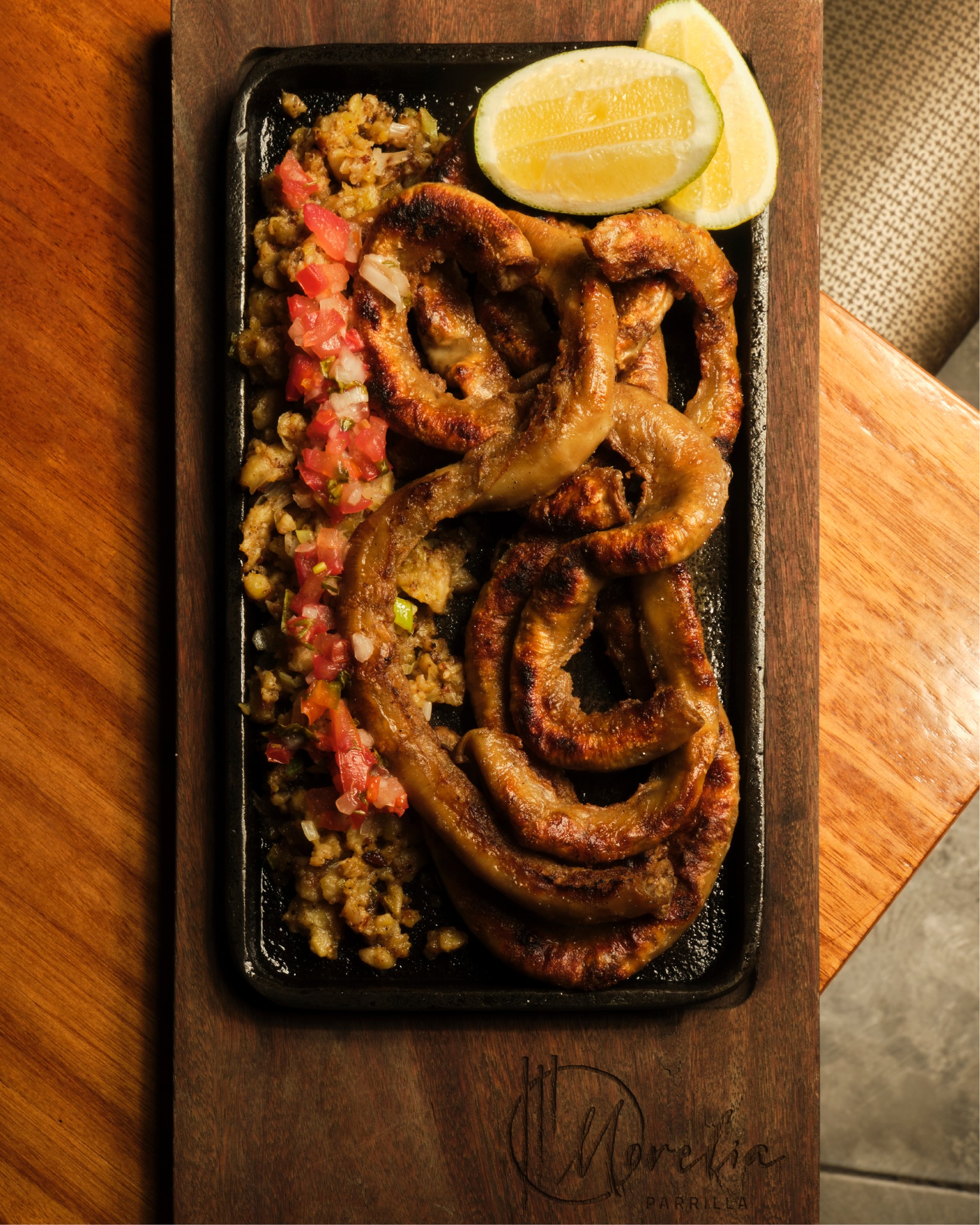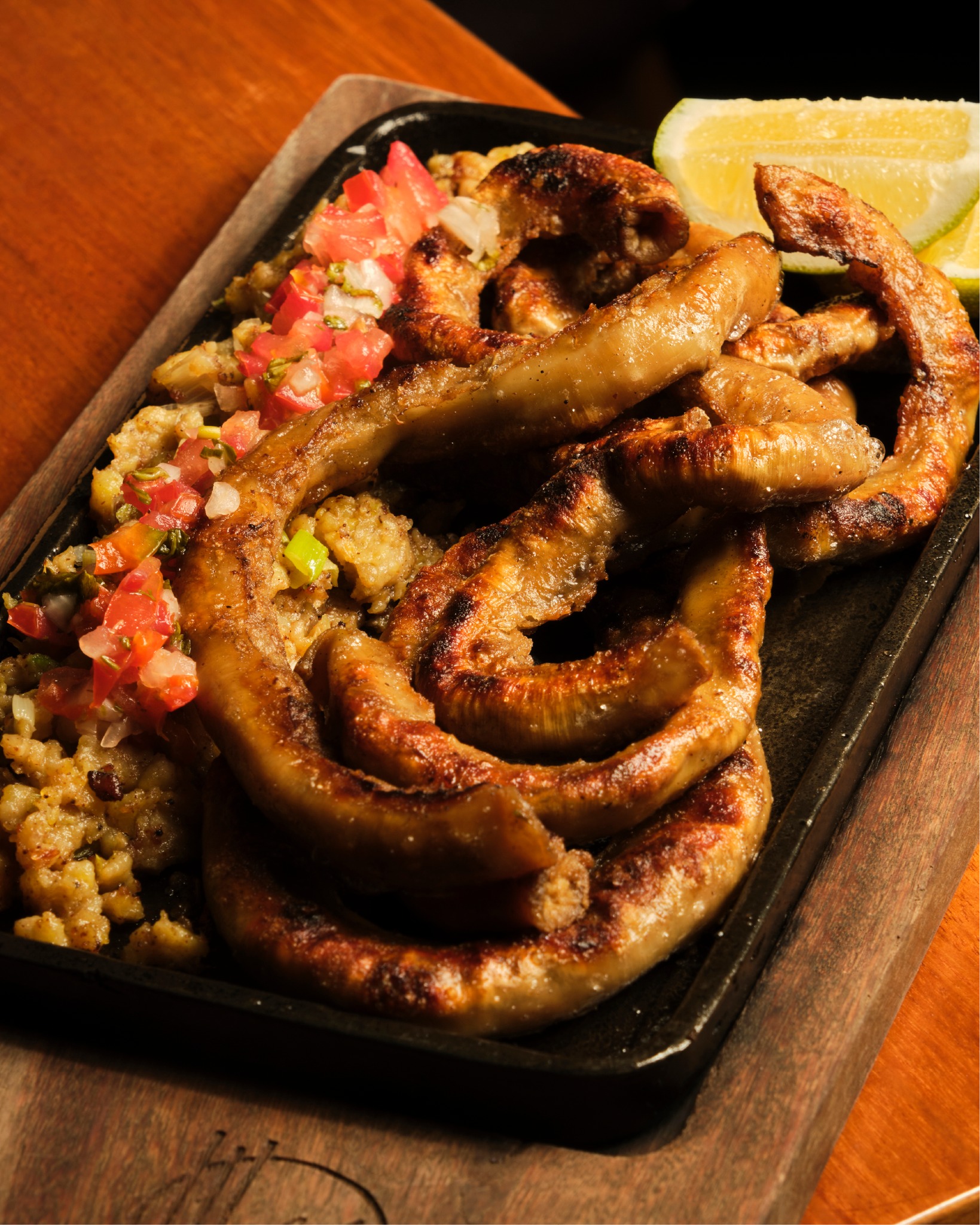 Chinchulines asados con molo de guineo de seda